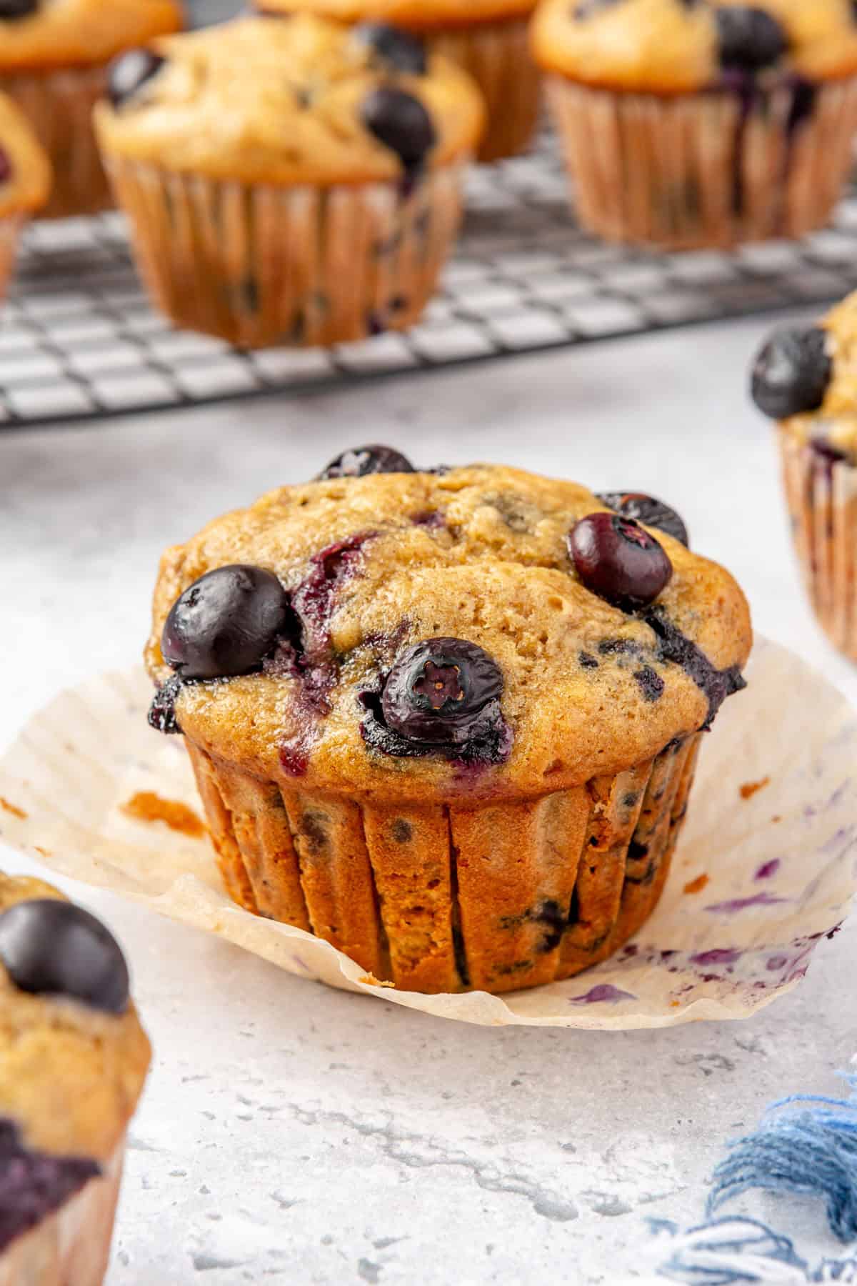 Estos muffins de arándanos son mantecosos, suaves y húmedos. Para un sabor delicioso, añade una cobertura fácil de canela y azúcar moreno.